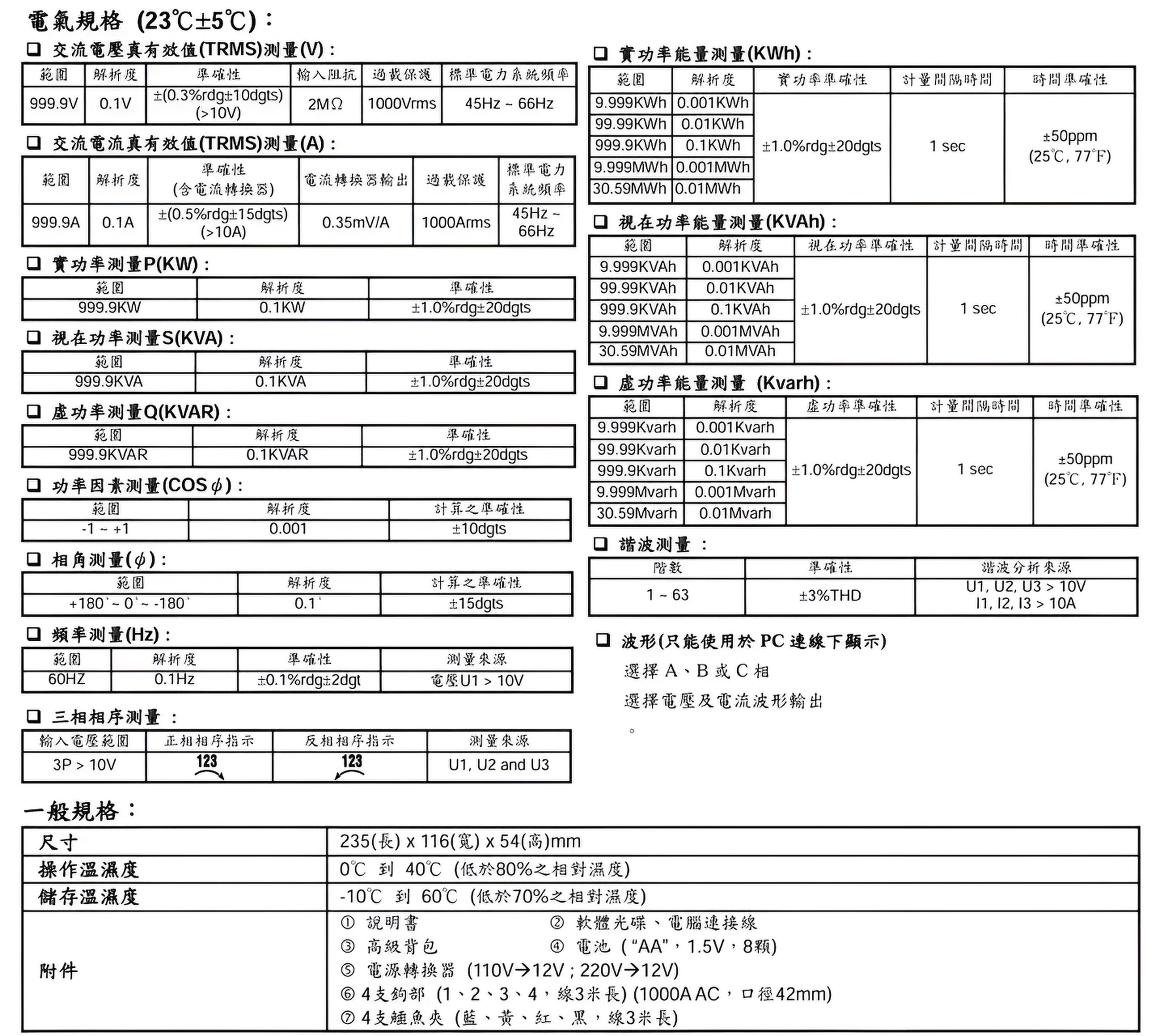 1P2W、1P3W、3P3W2M、3P3W3M及3P4W式功率測量。
